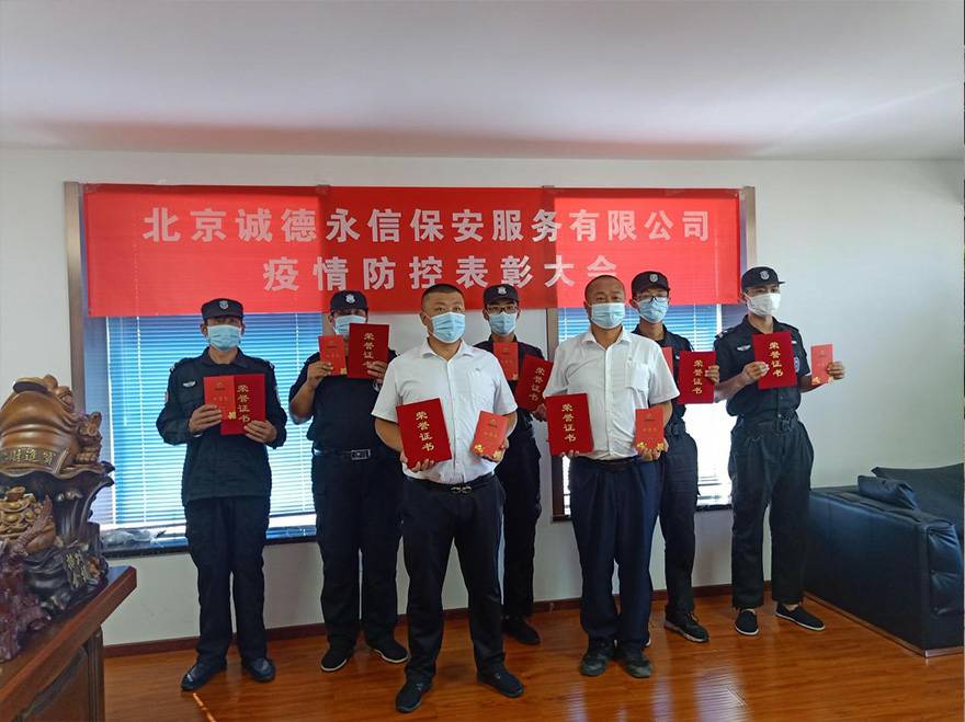 此次表彰大会,是我司对房山区阎村镇千禧家园抗疫工作的总结,同时表彰在抗疫期间的优秀员工并颁发证书和奖金。获奖人员分别为:郭宏宇、于龙、王立刚、李利景、时立辉、陈子阳及吴文平7位保安同志。受表彰的保安队长说:“作为社区防疫服务队员,面对疫情,责无旁贷,我是一名退伍军人,更应该挺在前面!”